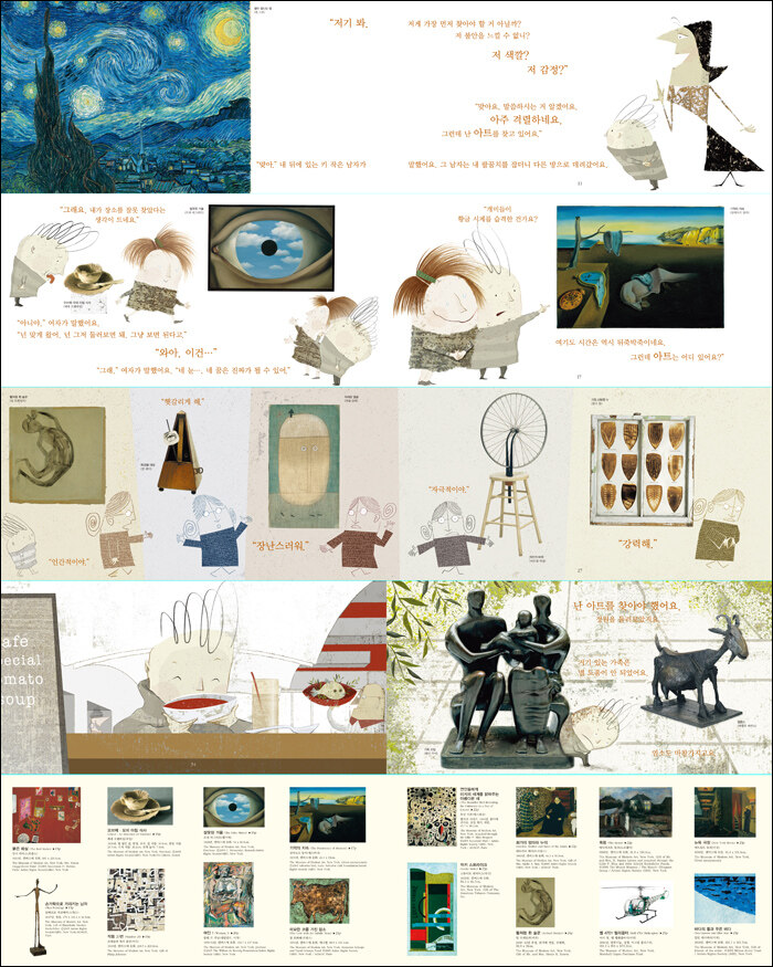 1. 세계 현대 미술 작품을 감상하다!이 책은 현대 미술의 중심지라 할 수 있는 뉴욕, 그중에서도 뉴욕현대미술관의 현대 미술 작품을 감상할 수 있는 책이다. 친구 아트를 찾아 미술관 안으로 들어온 주인공이 처음 만나게 되는 작품은 반 고흐의 ‘별이 빛나는 밤’이다. 앤디 워홀의 작품이나 알렉산더 칼더의 조각, 달리의 환상적 그림과 호안 미로의 작품, 백남준의 비디오 아트까지 총 64개의 현대 작품을 감상할 수 있다. 회화 뿐 아니라 조각, 설치 미술, 상업적인 제품과 영화와 독특한 형태의 작품까지 다양하게 감상할 수 있다. 많은 사람들이 현대 미술에 대해서 어떻게 감상해야 할지 고민을 하곤 하는데, 이 책은 내가 생각하는 아트를 찾는다는 마음으로 편하게 모든 것을 감상하게 한다. 모네의 커다란 작품이 주는 감탄사도 있지만, 베르너 팬톤의 플라스틱으로 만든 의자도 아트라고 할 수 있다는 다양한 관점을 재미있게 전하고 있다.