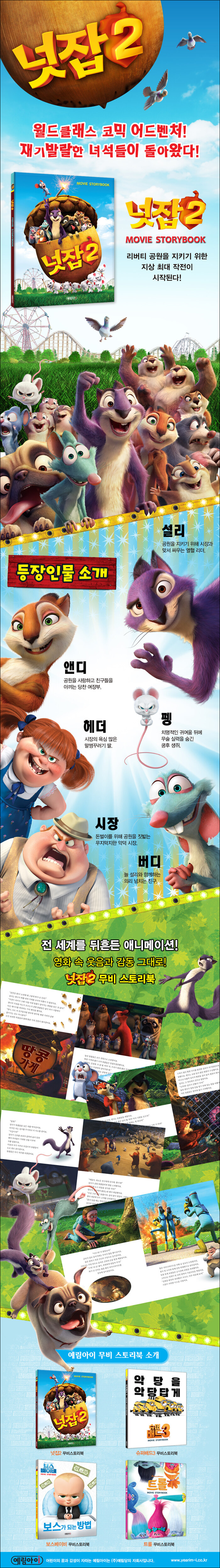 예림아이 무비스토릭북으로 만나요!국내 기획 투자로 세계 시장 공략에 성공하며 전 세계적으로 약 1억 2천만 불의 박스오피스 매출을 올린 애니메이션 <넛잡: 땅콩 도둑들>의 속편, <넛잡2>를 예림아이 무비 스토리북으로 만나 보세요!