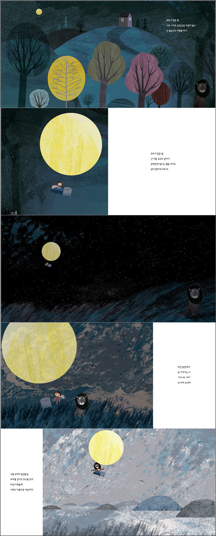 모두가 잠든 밤에 떠나는 꿈속으로의 여행 아이는 몸집이 아주 커다란 사자 친구와 함께 바다를 건너고 호수를 건넙니다. 폭풍우가 몰아쳐도 곁을 지켜 주는 친구가 있기에 두렵지 않습니다. 아이는 친구와 함께 흔들리는 배 위에서 파도를 타며 어둠 속을 항해합니다. 바닷속으로 들어간 아이는 커다란 고래를 보아도 겁내지 않고 함께 춤추듯 헤엄칩니다. 더 깊은 바닷속으로 들어가 해파리 무리와 어울리기도 합니다. 친구의 등에 올라 숲속으로 들어가면 많은 동물 친구들이 기다리고 있습니다. 꿈속 나라를 여행하는 사람은 비단 아이뿐만이 아닙니다. 현실에서 이루지 못했던 꿈을 꾸고 있는 친구들 또한 등장하지요. 그렇게 아이와 친구들은 시간 가는 줄을 모르고 어울려 놉니다. 그사이 밤의 빛깔이 점점 옅어지고, 아침이 살그머니 고개를 내밀기 시작합니다. 아이와 친구는 서둘러 꿈속 나라를 떠나고, 함께 황금빛 햇살을 마주합니다. 친구는 어느새 소녀의 품속 인형이 된 채로, 두 친구는 또 다른 새날을 맞이합니다.