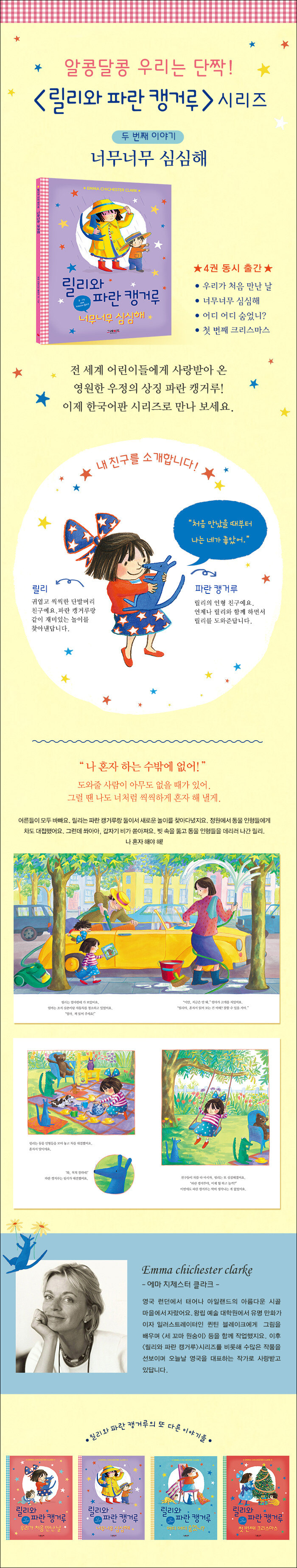 이제 한국어판 시리즈로 만나보세요! <릴리와 파란 캥거루>는 영국의 유명 그림책 작가 에마 치체스터 클라크가 오랜 세월에 걸쳐 그려 온 그림책 시리즈예요. 영국 하퍼콜린스 출판사에서 출간된 이래 지금까지 영국은 물론, 전 세계 어린이들로부터 널리 사랑받아 온 영원한 우정의 상징이지요.