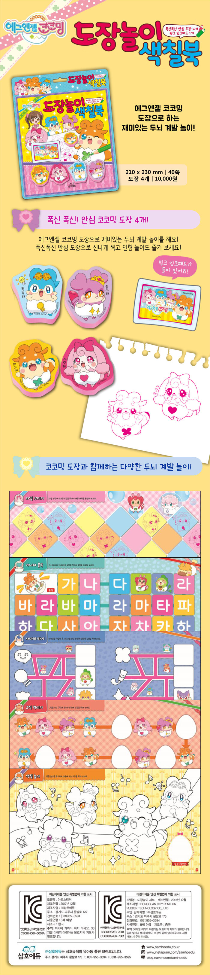 - 에그엔젤 코코밍 도장을 콩콩 찍으며 하는 재미있는 두뇌 계발 놀이북!폭신폭신 귀엽고 깜찍한 코코밍 도장 4종과 핑크색 잉크 패드로 재미있는 코코밍 도장 놀이를 해 보세요!