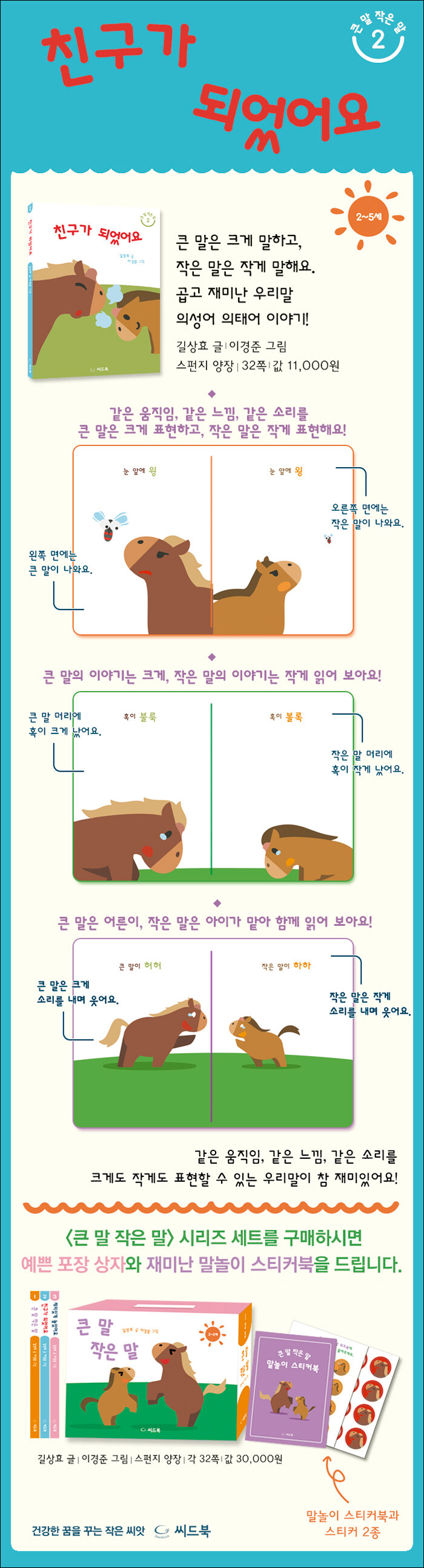 큰 말 작은 말 시리즈 2권. 큰말과 작은 말이 작은 파리 덕분에 만나 훈훈하게 우정을 쌓는 이야기를 다채로운 의성어와 의태어로 담아냈다. 같은 상황에서 같은 동작을 하고 같은 소리를 내지만, 큰 말은 크게 하고 작은 말은 작게 한다. 소리 내어 아이와 함께 읽어 보면 느낌의 차이를 확연히 알 수 있는 재밌는 경험을 할 수 있다.