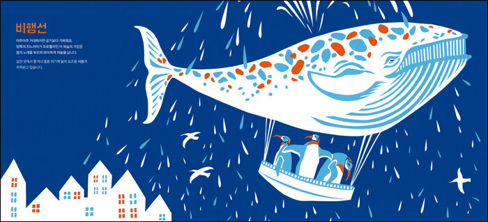 동물들의 이유 있는 변신 고래, 기린, 들소, 잠자리, 닭 등의 다양한 동물들은 각기 특성에 맞춰, 모터와 엔진으로 움직이는 탈것의 세계라는 새로운 맥락에 놓이게 되었습니다. 어린이 독자들은 각 장마다 탈것 뒤에 어떤 동물이 숨어 있는지 궁금할 거예요. 시적인 상상과 과학적 사실, 환경에 관한 메시지가 오묘하게 뒤섞여 있는 텍스트가 독자들에게 힌트를 줄 겁니다. (예를 들면, 로켓은 광대하고 생명체의 밀도가 희박한 곳에서 살아간다고 적혀 있어요. 이 설명은 로켓이 운행되는 우주에도 해당되고, 흡혈오징어가 사는 심해에도 해당이 됩니다!) 어린이들은 재미있게 수수께끼를 푸는 중에 동물과 탈것에 대한 지식을 익히게 되어요. 그중에는 익히 알고 있던 것도, 생소한 것도 있지요. 마지막 장에는 실제 동물들의 이름과 설명이 적혀 있어 수수께끼의 비밀을 드러냅니다. 하지만 무엇보다 소중한 것은 책에 담긴 창의력과 상상력이 독자들에게 전해지는 것일 거예요.