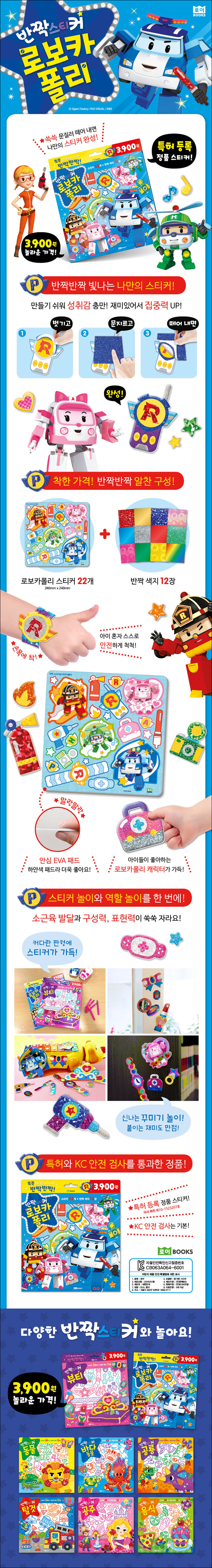 반짝 스티커 시리즈. ‘로보카폴리’ 편에서는 폴리, 엠버, 로이, 헬리 캐릭터 뿐만 아니라, 경광봉, 무전기 등 로보카폴리와 관련된 다양한 그림이 반짝 스티커로 구성되어 있다. 손목에 직접 착용할 수 있는 시계 스티커도 있으며, 아이들이 좋아하는 대상을 쓱쓱 문지르고 떼어 내면 나만의 스티커가 완성된다.