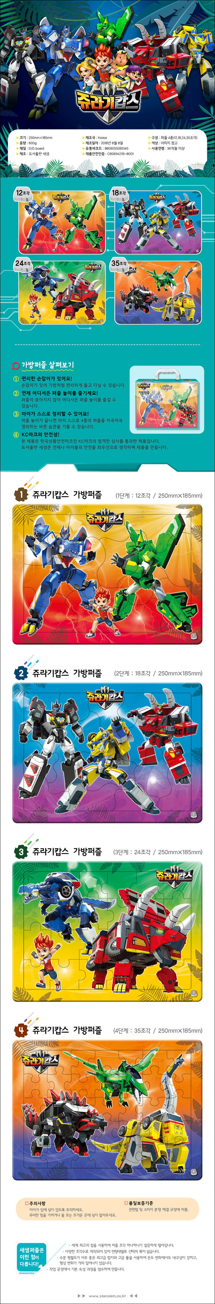 쥬라기캅스의 공룡변신로봇들과 캐릭터로 구성된 4개의 판퍼즐이 하나의 가방에 들어있는 상품이다. 퍼즐이 쏟아지지 않아 언제 어디서든 퍼즐 놀이를 즐길 수 있으며, 퍼즐 놀이가 끝나면 아이 스스로 4종의 퍼즐을 차곡차곡 정리하는 바른 습관을 기를 수 있다. 퍼즐은 손동작을 통한 지능개발에 가장 적합한 교재이며 퍼즐 조각을 맞추며 구성능력을 기를 수 있다. 퍼즐조각을 하나하나 맞추는 동안 집중력을 향상시키고 기억력을 길러 준다.