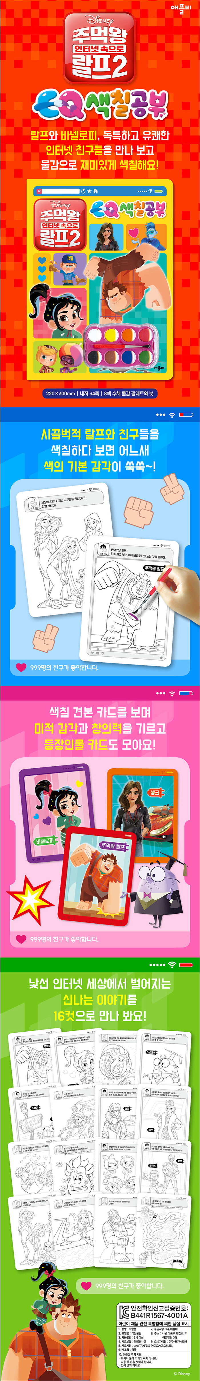 신기하고 놀라운 인터넷 세상에 빠진 랄프와 바넬로피의 이야기를 만나고, 신나는 색칠놀이도 즐겨보자. 8색 물감 팔레트와 붓, 오려서 완성하는 캐릭터 카드가 들어 있다. 8장면은 색칠 견본을 보고, 8장면은 자유롭게 색칠해 볼 수 있으며, 미로 찾기와 그림 찾기 활동도 즐겨 볼 수 있다.