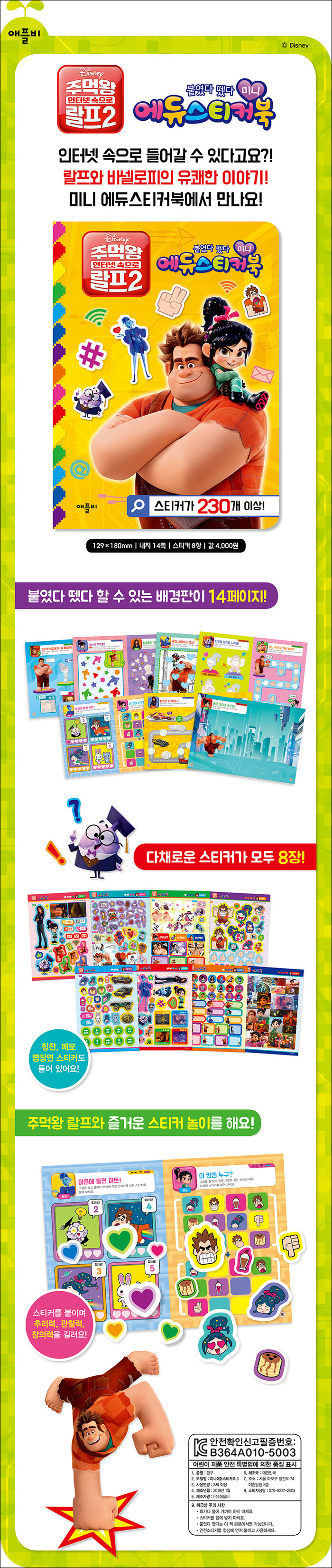 좌충우돌 랄프와 귀여운 바넬로피, 다양한 디즈니 캐릭터 스티커를 붙였다 뗐다 하면서 추리력, 관찰력, 창의력을 길러요!* 붙였다 뗐다 할 수 있는 배경판이 14페이지!