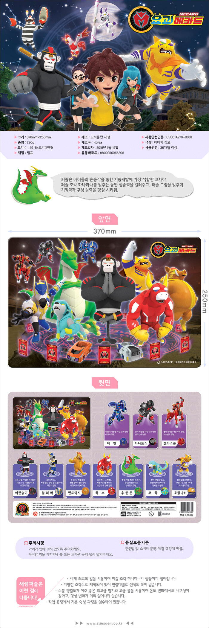요괴메카드의 십이지 정령과 수호 정령을 8절 퍼즐을 통해서 만나보자. 퍼즐 조각 하나하나를 맞추는 동안 집중력을 키워줄 수 있으며, 퍼즐 그림을 맞추며 기억력과 구성 능력을 향상 시켜 준다. 손근육을 발달시키고 집중력과 관찰력 향상에 많은 도움을 주어 지능개발에 매우 좋은 판 퍼즐이다.