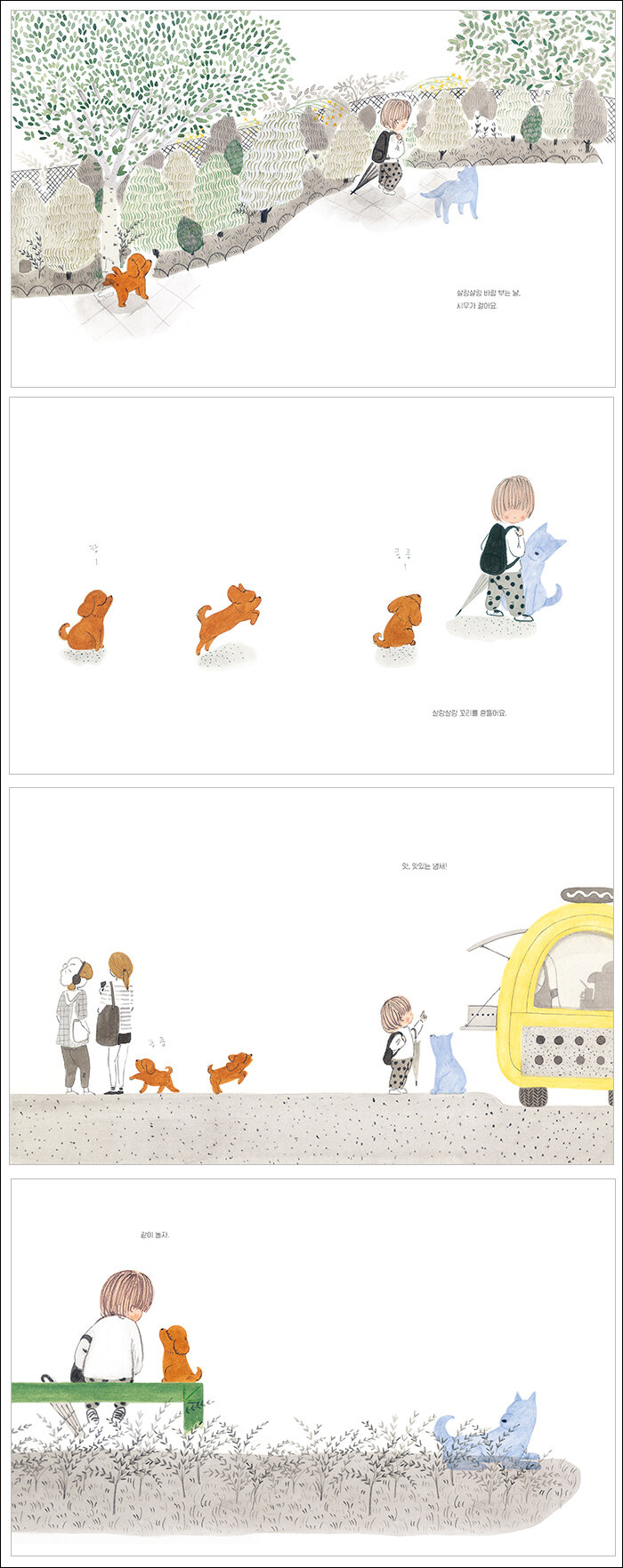 숨겨진 마음을 담담하게 그려낸 그림책 작가는 슬픔을 표현하려는 듯 그림의 배경에 무채색을 많이 썼다. 그 배경 위에 갈색 강아지가 휑한 벌판 위에 홀로 피어난 노란 꽃처럼 등장한다. 그리고 투명한 몸의 형태만으로 파란 개의 마음을 그리고, 머리카락에 가려져 보이지 않지만 시우의 슬픈 눈을 떠올릴 수 있게 해 준다. 이렇듯 간결하고 담담하게 그려낸 그림으로 이 셋의 복잡한 감정을 우리가 들여다보고 느낄 수 있게 만들어 준다. 갈색 강아지의 경쾌함과 시우의 슬픔, 그리고 파란 개의 걱정스러운 마음 뒤에 숨겨진 각자의 외로움을 교감하고 서로에 대한 사랑을 느끼는 순간, 작가의 따뜻한 마음을 발견할 수 있다.