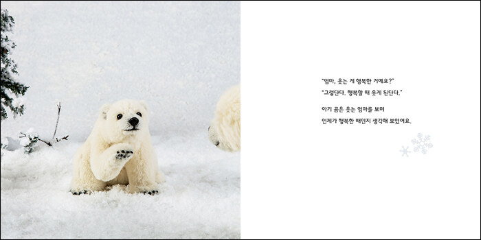 엄마, 웃는 게 행복한 거예요?아기 곰은 오늘 처음 바다에 수영을 하러 가요. 벌써 바다에서 수영할 때가 됐다니 엄마 곰은 아기 곰을 보며 기뻐했지요. 아기 곰은 기쁘다는 말이 무슨 뜻인지 궁금했어요. 엄마 곰에게 물으니, 기쁜 건 행복한 거래요. 엄마 곰은 아기 곰이 있어서 행복하다고 말했어요. 아기 곰 때문에 기분이 좋아지고 웃게 되니까 그렇대요.