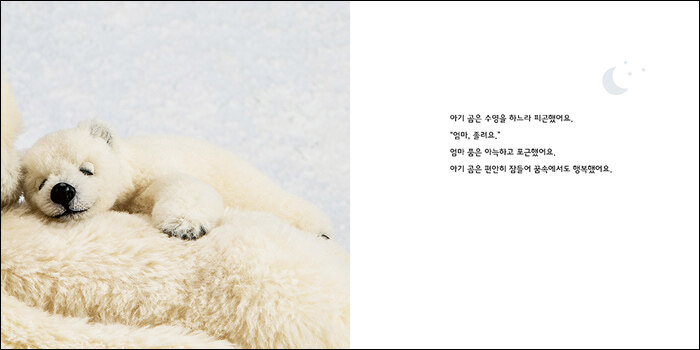 아기 곰은 언제가 행복한 때인지 생각해 보았어요. 엄마가 비행기 태워 줬을 때 신났던 것, 엄마랑 춤추며 노래 불렀던 것, 엄마 등에 타서 따뜻한 것 그리고 엄마가 자고 일어나서 뽀뽀해 줄 때랑 사랑한다고 꼭 안아 줬을 때, 친구들과 얼음땡 놀이를 할 때 행복했었어요. 아기 곰은 항상 행복하고 싶다고 생각했어요. 처음으로 바다에서 수영을 한 아기 곰은 엄마 품에서 편안히 잠들었어요. 그리고 꿈속에서도 행복했지요.