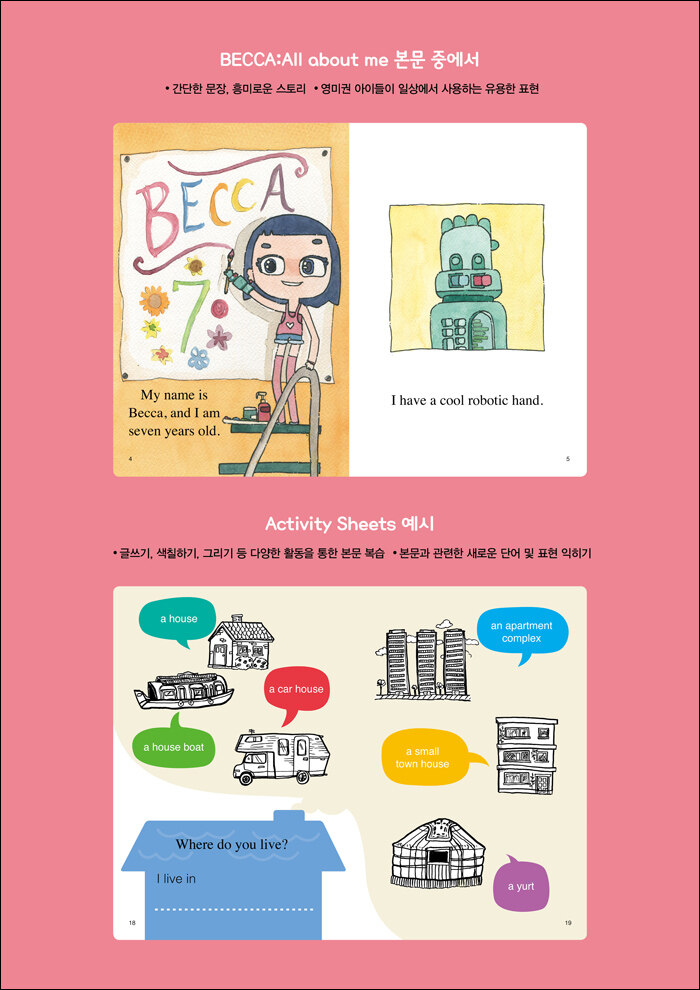 베카는 언제나 즐거운 소녀입니다. 한국인 부모님을 둔 베카는 오른손은 없지만 언제나 자신감이 넘치고 긍정적이며 새로운 것에 대한 모험심이 강합니다. 패션 디자이너를 꿈꾸는 베카는 로봇 공학자인 아빠가 만들어준 로봇 팔로 그림을 그리고 바느질하는 것을 좋아합니다. 이 세트에서 베카는 ‘나에 관한 모든 것 (All about me)’, ‘엄마 (Mom)’, ‘아빠 (Dad)’, ‘형제자매 (Siblings)’, ‘반려동물 (Pets)’, ‘꿈 (Dreams)’, ‘취미 (Hobbies)’, ‘성격 (Personality)’ 등 여덟 가지 주제로 자신의 이야기를 들려줍니다. 어린이들이 베카와 함께 대화하고 상상력을 펼치는 동안 어린이들도 모르는 사이에 영어로 사고하는 말할 수 있는 능력까지 자연스럽게 익히게 될 것입니다. 또한 책을 자유롭게 활용할 수 있도록 구성했습니다. 각 책에 포함된 ‘엑티비티 시트’(Activity Sheets)’를 통해 새로운 어휘를 익히고 직접 단어를 활용해서 예문을 만들어 보면서 쓰기 능력도 향상 시킬 수 있습니다.