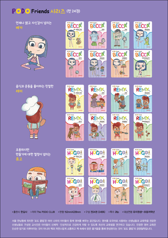 현재 시중에는 해외 출판사가 출간한 영어 책이 많습니다. 하지만 우리나라 어린이와 부모님이 쉽게 공감하고 친밀감을 느낄 수 있는 내용과 캐릭터를 찾기는 쉽지 않습니다. ‘포도 프렌즈(PODO Friends) 시리즈’에는 성장 배경과 성격이 각각 다른 매력적인 주인공 베카, 레미, 휴고가 등장합니다. 이들은 아동기 발달과정에서 아이들이 느끼고 경험할 수 있는 다양하고 친숙한 주제 안에서 각자 다른 생각을 전달하며 자신의 개성을 표현합니다. 이를 통해 어린이들은 자신과 비슷한 성격과 꿈을 지닌 주인공에게 쉽게 공감하고 몰입하며 영어로 사고하는 경험을 하게 될 것입니다. 또한 모든 책의 마지막 페이지에서 주인공은 독자 어린이들에게 “What about you?” “What is your favorite thing to do?” 와 같은 질문을 합니다. 아이들이 책을 읽고 바로 덮어버리는 것이 아니라 자기 스스로에 대해서 생각하고 표현할 수 있도록 유도합니다. 단순히 책을 읽는 즐거움 뿐만 아니라 영어로 생각하고 말할 수 있는 능력까지 자연스럽게 익히게 되는 것입니다.
