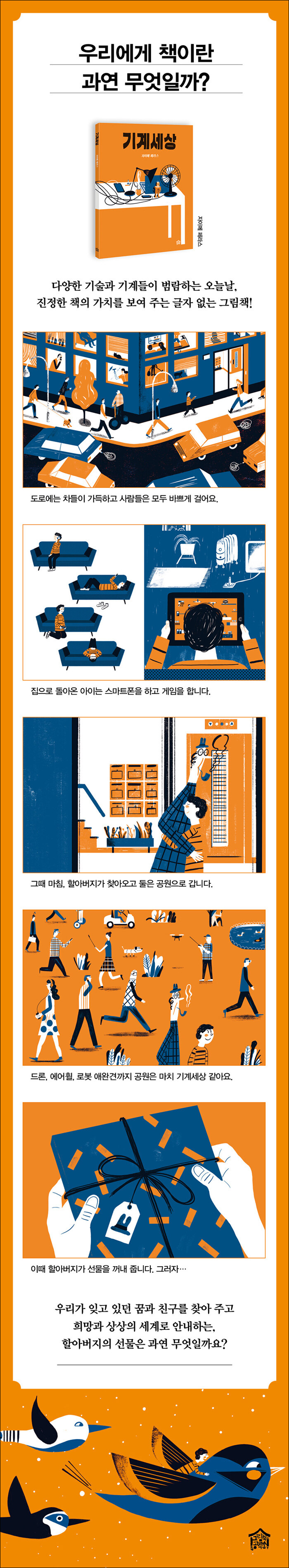 편집자 한 마디 하늘에는 비행기가 날고 도로에는 자동차가 달리지만, 저는 하늘에 떠가는 구름을 보면 왠지 마음이 편해지고 흙길을 걸으면 몸이 즐겁습니다. 그리고 책, 특히 그림책을 보면 기분이 좋아집니다. 하지만 이 책을 쳐음 보았을 때는 머리가 띵 했던 것 같습니다. 내가 만드는 책이 과연 세상에 충분히 유의미한가? 새삼 진지하게 고민하면서. 그러다 결국“책”의 의미를 말하는 이 책을 여러분께 소개하기로 했고, 세상에 있는 모든 책들을 더욱 아껴 주십사 하는 바람으로 발행일도 ‘세계 책의 날’로 삼았습니다. 책에 관한 책이니 만큼 책 고유의 색과 모양, 그리고 종이 질감마저 느끼시라고 표지에는 비닐 코팅을 하지 않은 대신 내구성을 위해 랩핑을 두 번했으니 참고해 주세요. 끝으로 저는 지금도 스마트폰을 손에 쥐고 있지만, 그럼에도 불구하고 기계세상을 살아가는 모두에게 선물 같은 그림책을 선보일 수 있도록 계속 노력하겠습니다.