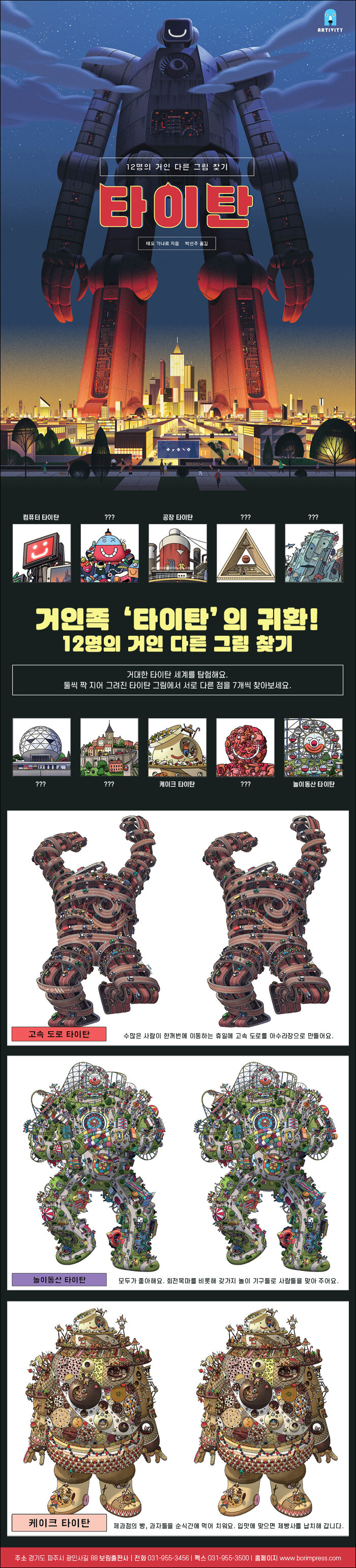 아티비티 시리즈. 거대하고 환상적인 거인족, 타이탄의 세계를 탐험한다. 지능과 기억력이 아주 뛰어난 컴퓨터 타이탄, 강한 독성 물질을 쉬지 않고 만들어서 지구를 오염하는 공장 타이탄, 설탕을 좋아해 빵과 과자들을 순식간에 먹어 치우는 케이크 타이탄, 사람들을 즐겁게 하는 놀이 기구를 잔뜩 가진 놀이동산 타이탄?. 둘씩 짝 지어 그려진 타이탄 그림에서 서로 다른 점을 7개씩 찾아보자.