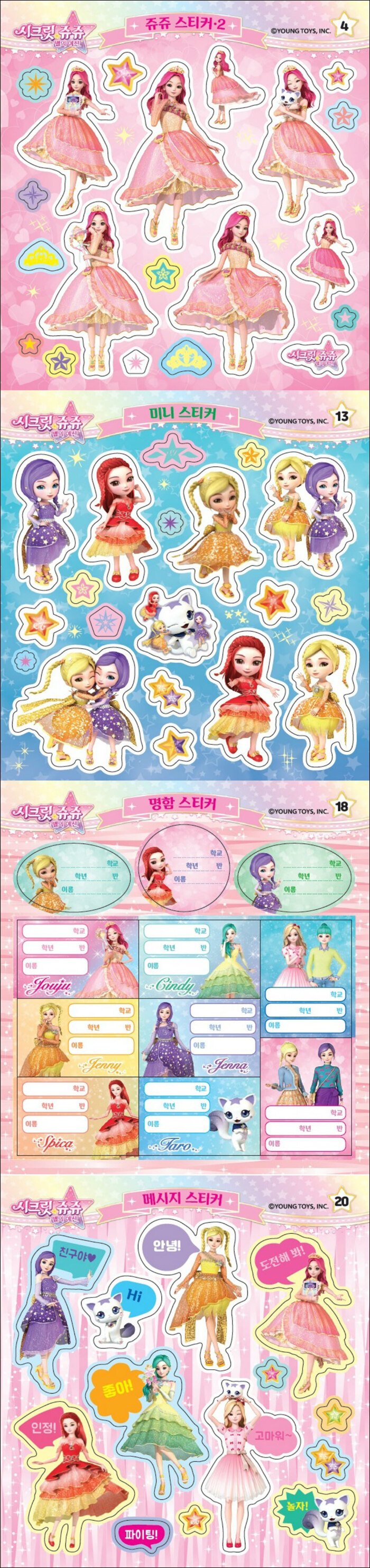새롭게 리뉴얼 된 쥬쥬와 친구들 스티커가 가득!13개의 애니메이션 시즌을 통해 어린이들의 사랑을 받아 온 시크릿 쥬쥬가 새로운 모습으로 다시 태어났습니다. 반짝반짝 빛나는 별자리를 콘셉트로 더욱 아름답고 멋지게 변신한 쥬쥬와 새로운 친구들을 다양한 스티커로 만나 보세요.