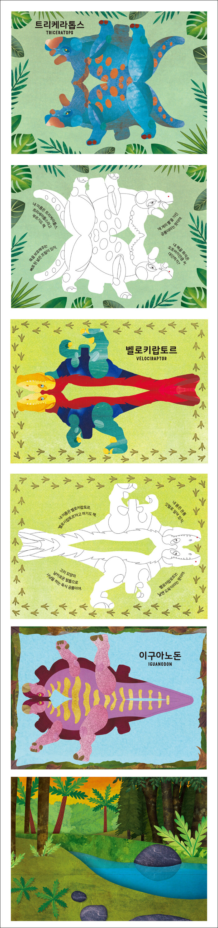 제공되는 배경에 공룡을 배치, 이야기 만들어내는 재미 추가 12종의 공룡 접기가 끝나면 이 공룡이 뛰어놀 수 있는 배경이 나온다. 뜯어서 입체적으로 만든 공룡을 제공되는 그림을 배경으로 세우면 그대로 아이만의 작품이 된다. 여기서부터 이 책은 새로운 시작을 맞이한다. 공룡에 배경이 생기면 공룡을 둘러싼 환경에 관심을 가지게 되고 아이들은 상상력을 발휘하여 이야기를 만들어 낼 것이기 때문이다.