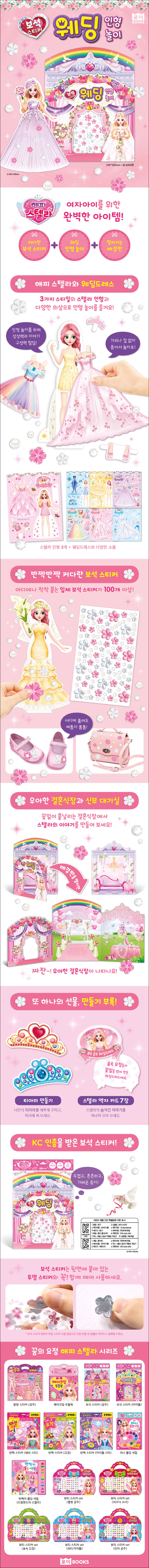 숲속 공주 웨딩드레스, 인어 공주 웨딩드레스 등 화려한 결혼식장에서 입는 아름다운 웨딩드레스가 가득 들어 있다. 그리고 푸른 바다를 닮은 조개 부케, 눈꽃 장식이 화려한 얼음 거울 같은 다양한 소품과 액세서리도 들어 있어 인형 놀이의 즐거움이 더욱 커진다. 아이들은 인형 놀이를 즐기며 다양한 역할 놀이도 하고, 재미난 스토리를 지어내면서 이야기 구성력과 창의력, 상상력, 표현력 등이 쑥쑥 자라게 될 것이다.