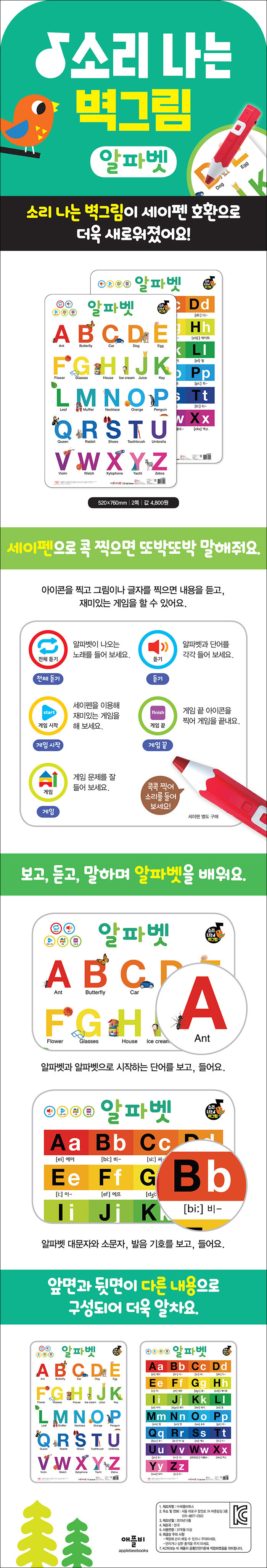알파벳과 함께 알파벳이 들어간 단어의 사진이 들어있다. 앞면에서는 A부터 Z까지 대문자를 알아보고, 뒷면에서는 대문자, 소문자, 발음 기호를 배울 수 있다. 세이펜으로 그림을 찍으면 영어로 읽어준다. 귀 기울여 듣고 따라 말하며 자연스럽게 인지 학습을 할 수 있다.