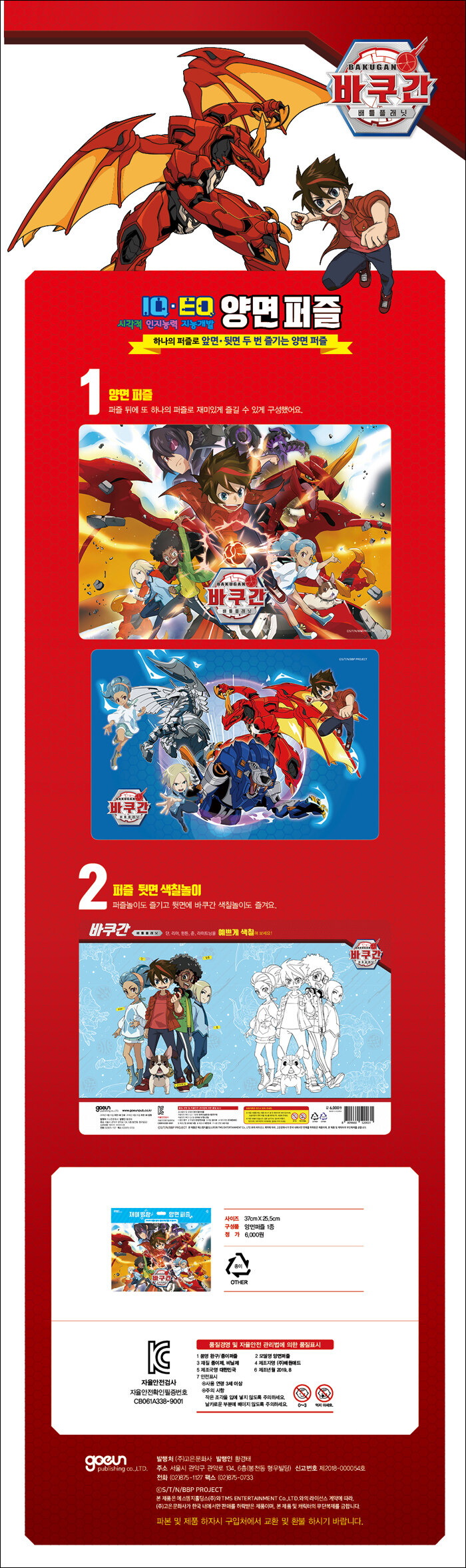 퍼즐판 뒷면에는 바쿠간 친구들을 색칠하며 색채감각과 표현력을 기를 수 있도록 구성했어요.