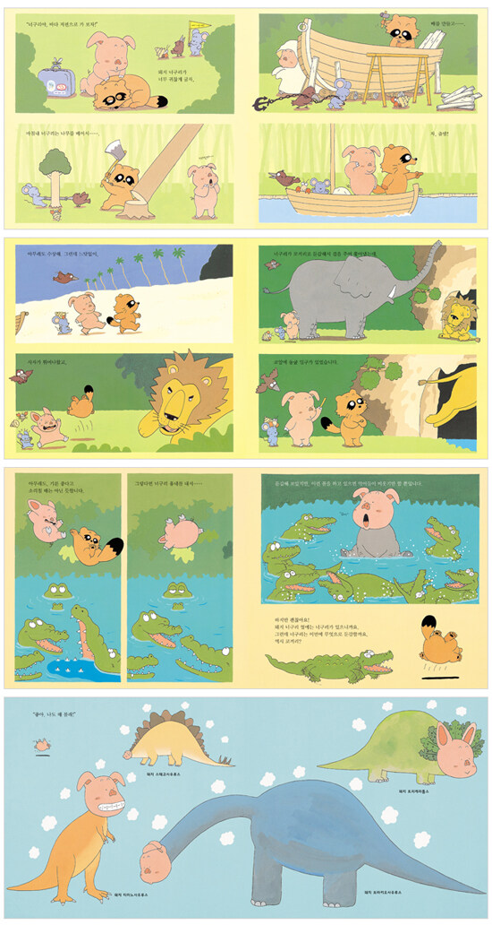 돼지 너구리, 섬에 가다!돼지 너구리는 너구리를 졸라 꿈에 그리던 바다 건너 섬으로 갔어요. 동굴 속도 탐험하고 섬에 사는 여러 동물 친구들도 만났지요. 섬에서 돌아온 돼지 너구리는 다시 또 다른 곳에 가고 싶대요. 그래서 날마다 너구리를 졸라요.