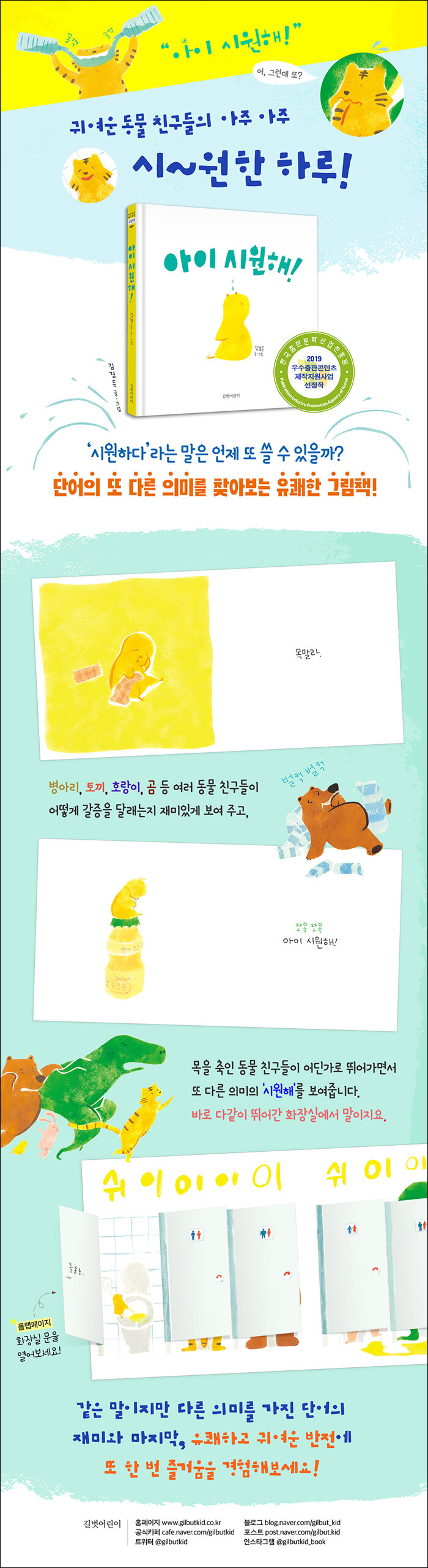 사랑스럽고 깜찍한 그림으로 눈길을 사로잡는 그림책 《아이 시원해!》는 한국출판문화산업진흥원에서 주관한 2019 우수출판콘텐츠 제작지원사업 선정작입니다. ‘시원하다’라는 말의 두 가지 의미를 목이 마른 동물 친구들의 이야기로 기발하고 참신하게 표현했습니다. 귀여운 반전이 숨어 있는 플랩 페이지를 펼치는 순간, 아이들은 책 읽는 재미에 흠뻑 빠져들 거예요!