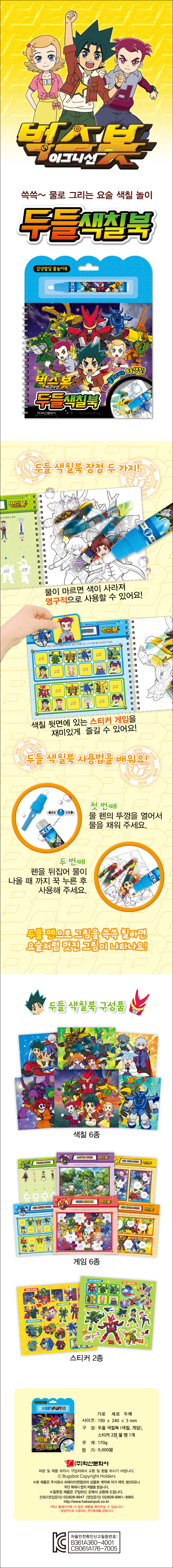 색칠놀이도 하고 스티커도 붙이며 놀 수 있는 색칠놀이북이다. 물 이외에 물감이나 색연필 등 미술도구가 필요없기 때문에 이동할 때나, 집에서 매우 간편하게 놀이할 수 있다. 물기가 마르면 원상태로 돌아가기 때문에 반복적으로 색칠할 수 있어 매우 경제적이다. 페이지마다 좋아하는 캐릭터를 칠하면서 소근육 활동이 늘어나 집중력과 창의력이 발달되며 운필력이 향상된다. 또한 손과 눈의 협응력을 길러주어 자연스럽게 형태와 색채의 감각을 익힐 수 있다.