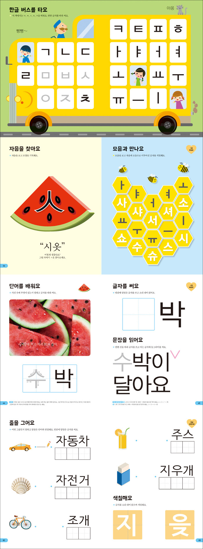 1. 자음, 모음 → 글자 → 단어 → 문장 → 복습으로 이루어진 학습 과정 학습 순서에 따라 자음, 모음, 글자, 단어, 문장을 익힙니다. 다양한 사진이나 그림과 함께 글자를 반복하여 학습합니다.
