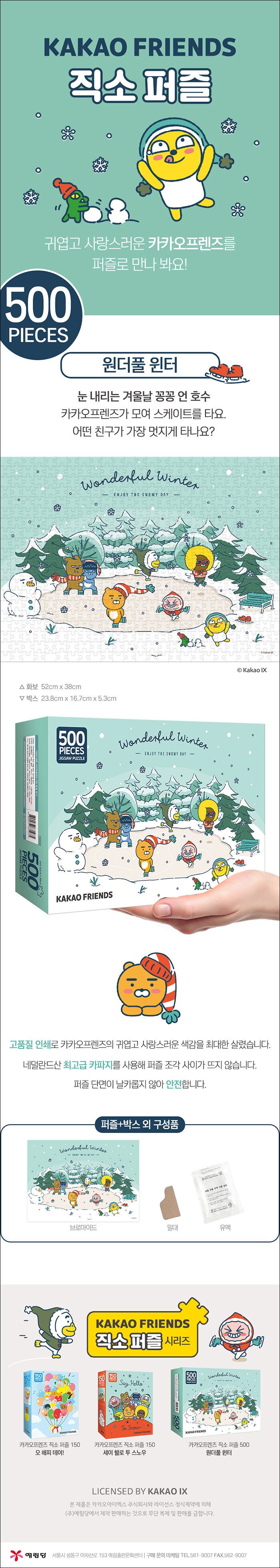 ★ 카카오프렌즈 직소 퍼즐 500은?1. 최고급 카파지를 사용해 색이 선명하고 퍼즐 조각 사이가 뜨지 않아요.