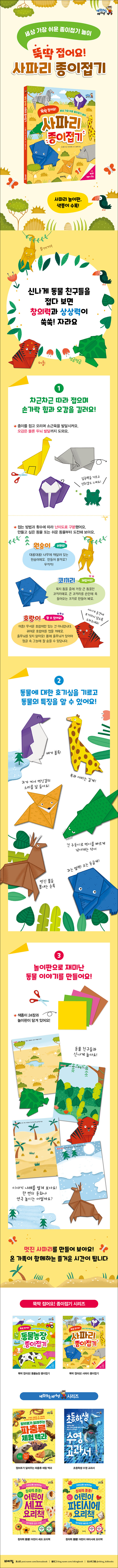★사파리 놀이판으로 재미난 이야기를 만들어요!부록에는 동물을 접을 수 있는 24장의 색종이와 사파리 놀이판을 담았어요. 따로 색종이를 구매하지 않고 책만 있어도 언제 어디서든 멋진 동물을 만들 수 있답니다. 놀이판은 아이들이 완성한 동물 종이접기를 가지고 놀 수 있는 배경 판입니다. 놀이판을 활용해 재미난 동물 이야기를 만들어 보세요. 한 편의 동화나 연극 놀이는 어떨까요? 만들 수 있는 이야기는 무궁무진합니다. 놀이판으로 이야기꽃을 피워 보세요. 온 가족이 함께하는 즐거운 시간이 될 거예요.