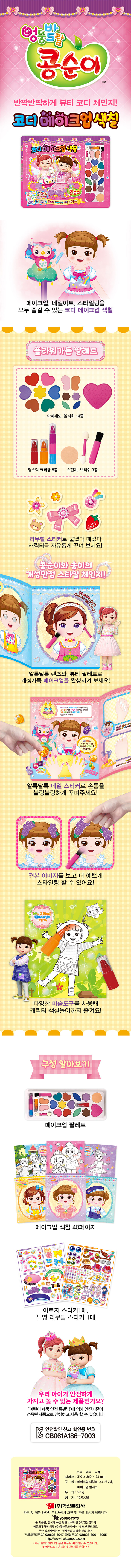 나는야 멋진 메이크업 아티스트! 다양한 메이크업 도구와 블링블링한 보석스티커 들로 콩순이와 친구들을 예쁘게 꾸밀 수 있다. 아이들이 좋아하는 메이크업 색칠놀이 뿐만 아니라 액세서리스티커와 렌즈, 네일스티커로 원하는 곳에 붙였다 떼었다하며 스티커놀이까지 함께 즐길 수 있는 알찬 놀이북이다.