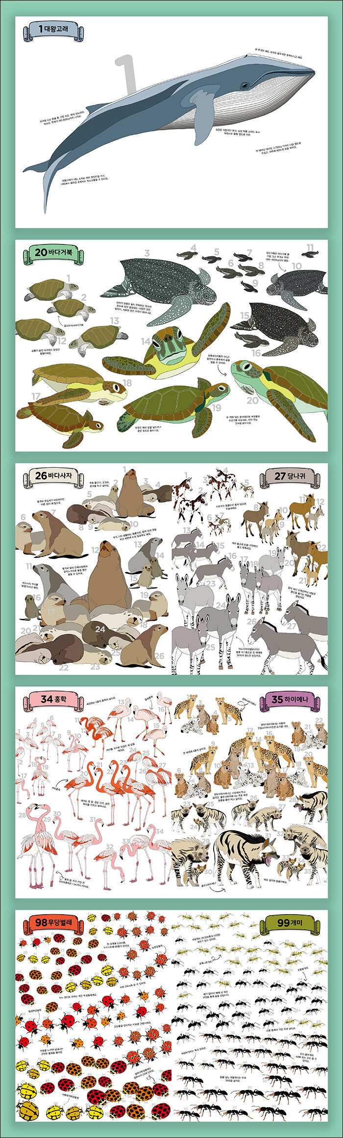 100종이나 되는 동물을 1마리부터 100마리까지 세며 쉽고 재미있게 숫자를 익힐 수 있도록 했다. 특히 모든 동물에 1부터 100까지의 숫자를 차례대로 달아 놓아 더욱 흥미롭다. 이 숫자를 하나씩 따라 읽다 보면 어느새 100까지의 숫자를 익히게 된다. 게다가 놀라운 동물 정보도 얻을 수 있어서 동물에 대해서도 자연스럽게 배우게 된다.