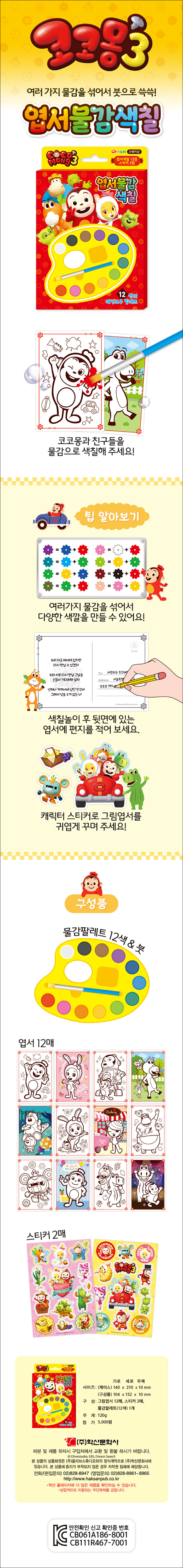 12가지 색깔의 물감과 붓이 들어간 만능 팔레트! 아이가 좋아하는 캐릭터를 다양한 색상으로 색칠놀이할 수 있다. 펜이 아닌 붓으로 내가 원하는 색을 만들어 색칠하면서 집중력과 창의력을 기르며 색에 대한 다양한 경험을 할 수 있어 미술적 색채감각을 키워준다. 색칠놀이 뒷면은 엽서로 구성되어 있어, 세상에 하나뿐인 예쁜 엽서를 만들어 소중한 친구에게 선물할 수 있다. 다양한 스티커 2매까지 들어있어 더욱더 예쁘게 꾸밀 수 있다.