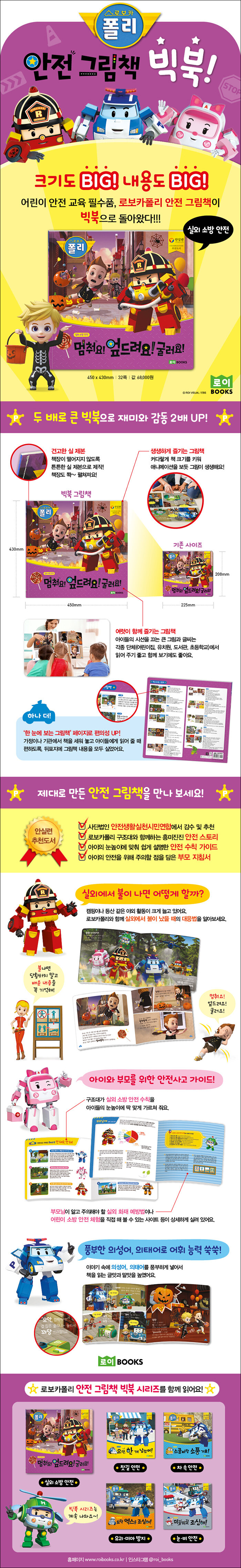 어린이 안전 교육 필수품, <로보카폴리 안전 그림책>이 빅북(Big Book)으로 돌아왔다!!!기존 판형보다 200%나 커져 더 넓은 화면으로 로보카폴리 애니메이션을 보듯 생생하게 실외 소방 안전을 배울 수 있어요! 실로 단단하게 제본하여 책장이 떨어질 염려도 없고, 가정에서는 물론 각종 단체(어린이집, 유치원, 도서관, 초등학교)에서 여럿이 빙 둘러앉아 책 읽기를 즐길 수 있지요. 책 뒤표지에는 그림책의 내용을 모두 실어서, 책을 세워 놓고 아이들에게 읽어 주기 편하도록 세심한 배려를 했답니다.