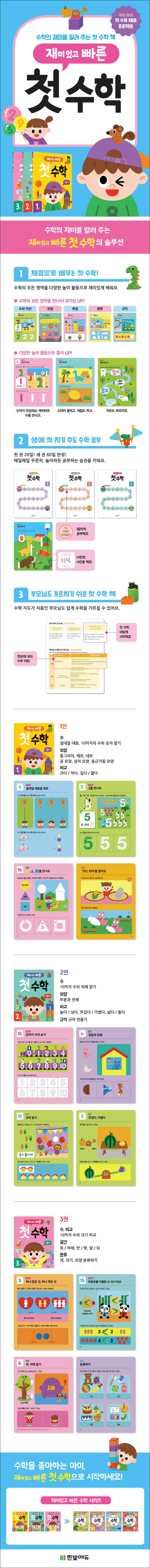 우리 아이 첫 수학 책우리 아이 첫 수학, 즐거운 놀이로 시작하세요. '첫 수학'은 아이들이 좋아하는 색칠하기, 미로 찾기, 그림 찾기 등 다양한 놀이 활동으로 수를 익히게 합니다. 유아를 위한 수학은 단순히 숫자를 읽고, 쓰고 세는 것이 전부가 아닙니다. 주위의 여러 가지 사물과 일상생활의 경험 속에서 수학에 대한 긍정적인 태도를 기르는 것이 우선입니다. '재미있고 빠른 첫 수학'은 생생한 그림과 풍부한 놀이 활동으로 아이에게 수학은 재미있다는 첫 번째 경험을 제공합니다. 수학의 모든 영역을 골고루 접하며, '공부'가 아닌 '놀이'로 수학을 만나게 해 주세요.