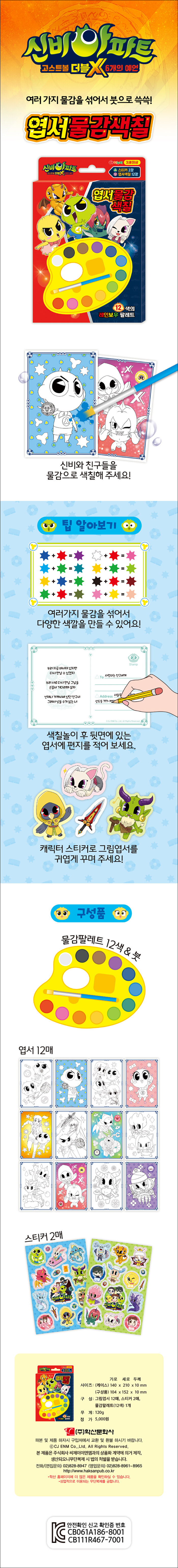 12가지 색깔의 물감과 붓이 들어간 만능 팔레트. 12가지 물감으로 여러 가지 색을 만들어 색깔 익히기를 통해 미술적 감각을 기를 수 있다. 아이가 좋아하는 캐릭터를 칠하다 보면 집중력과 주의력을 높이며 동시에 창의력과 색채 감각이 향상된다. 또한 물감 색칠을 하고 다양한 스티커로 엽서를 꾸며 나만의 멋진 엽서가 완성된다.