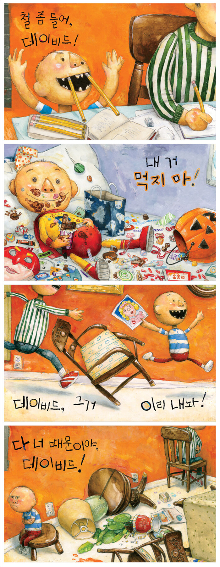 아이들의 솔직하고 꾸밈없는 행동을 생생하게 표현한 그림책 데이비드 섀넌의 그림책은 글이 아닌 그림을 중심으로 이야기를 이끌어 나간다는 특징이 있습니다. 아이가 쓴 것처럼 삐뚤빼뚤한 글은 하나의 그림 같은 역할을 하고 있을 뿐만 아니라 아직 글을 읽지 못하는 아이도 충분히 이해할 수 있습니다. 또한 뾰족뾰족한 이빨이 두드러진 말썽꾸러기 데이비드의 모습은 선명한 색상의 그림과 매우 잘 어울립니다.