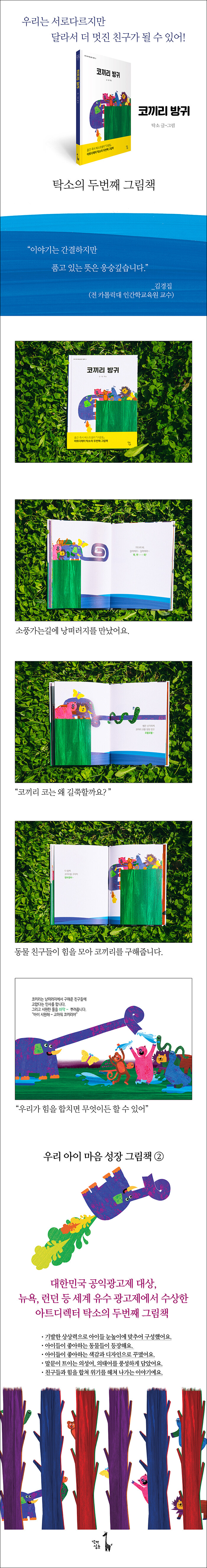 예기치 못한 어려움에 함께한 친구들재밌고 신선한 아이디어와 다양한 색채를 이용한 그림으로 널리 사랑받는 『구름똥』에 이어 아트디렉터 탁소가 내놓은 두번째 그림책 『코끼리 방귀』에는 소풍을 떠나는 동물들의 이야기가 담겨 있습니다. 동물 친구들이 예기치 못한 어려움에 빠졌을 때 서로서로 힘을 모아 위기를 헤쳐 나가는 모습을 보며, 혼자서는 해내기 힘든 일도 서로 힘을 합치면 거뜬히 이겨낼 수 있다는 훈훈한 메시지를 건네줍니다.
