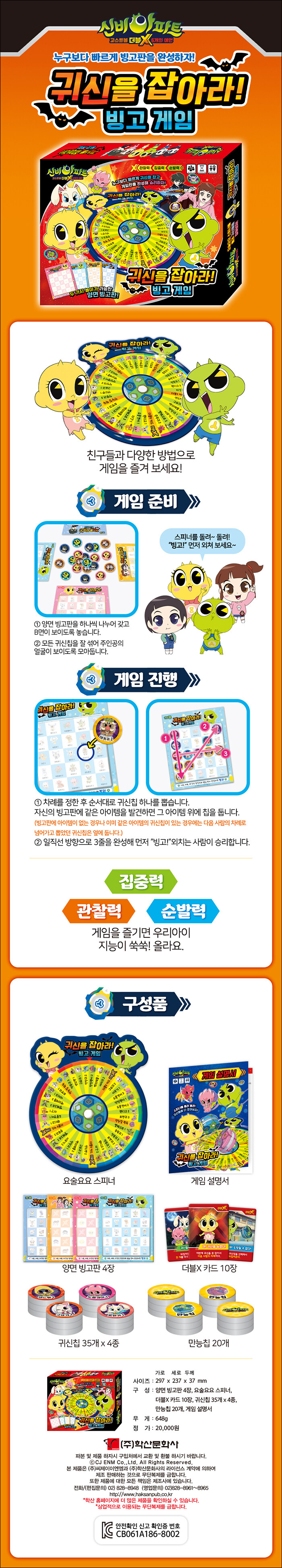 게임칩을 빙고판에 배치한 후 스피너를 돌려 나오는 아이템을 찾아 뒤집는 게임이다. 게임판의 그림과 귀신칩을 서로 맞춰보며 관찰력을 기르고, 내가 가진 더블X 카드를 활용해 상대방보다 빨리 빙고판을 완성할 수 있는 방법을 생각해보며 집중력을 기른다. 직선, 대각선 방항의 3줄을 완성한 후 누구보다 빠르게 "빙고!" 를 외치면서 동시에 순발력이 쑥쑥 자란다.