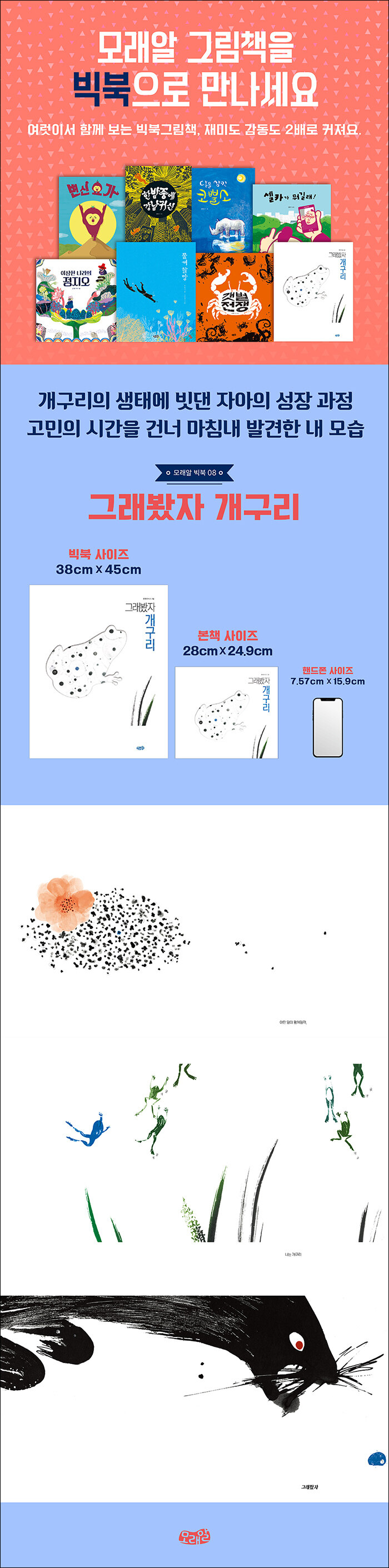 모래알 빅북 그림책 소개 모래알그림책을 빅북으로 만들었습니다. 빅북은 본 책의 두 배 이상 큰 크기로 특수 제작한 그림책으로 도서관, 초등학교, 유치원 등에서 작가 강연, 책 읽어주기 수업 및 다양한 독서 활동에 활용하기 좋습니다. 커다란 그림으로 그림책을 만나면 어린 독자들이 더 큰 감동과 즐거움을 얻을 수 있습니다.