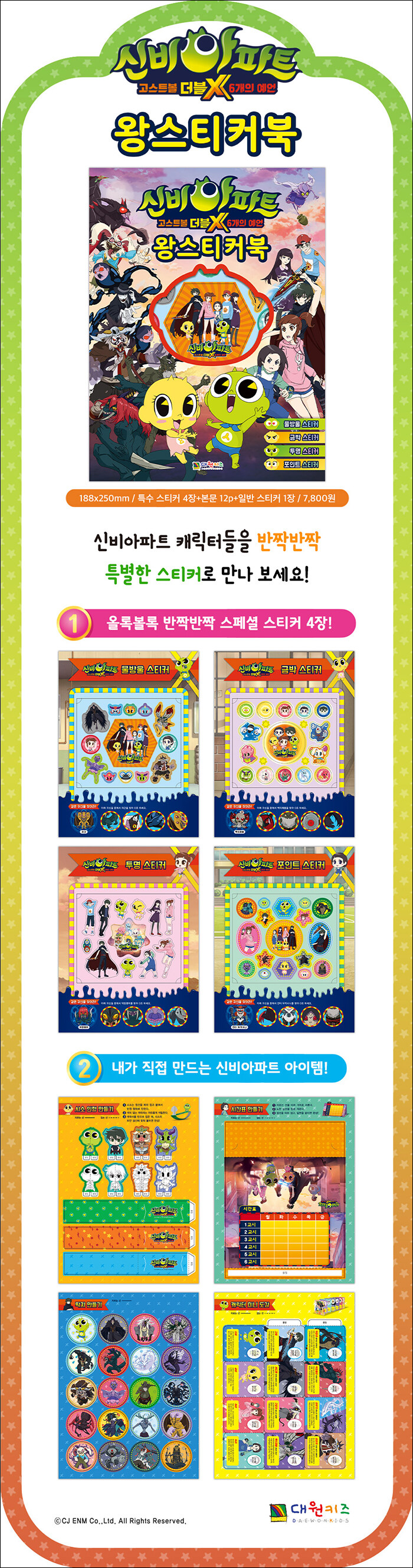 올록볼록 입체감이 느껴지는 물방울 스티커, 반짝반짝 화려한 금박 스티커, 배경이 투명해서 다양하게 활용할 수 있는 투명 스티커, 동그란 도트 포인트가 귀여운 포인트 스티커까지! 아주 특별한 <신비아파트> 스티커 4종류가 책 한 권에 쏙 들어 있어요.