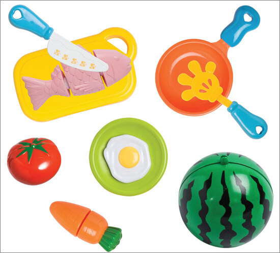 수박, 달걀 프라이, 토마토, 생선, 당근, 뒤집개, 칼, 도마, 접시, 프라이팬 등 요리놀이 장난감 10종이 들어 있는 요리놀이 그림책입니다.