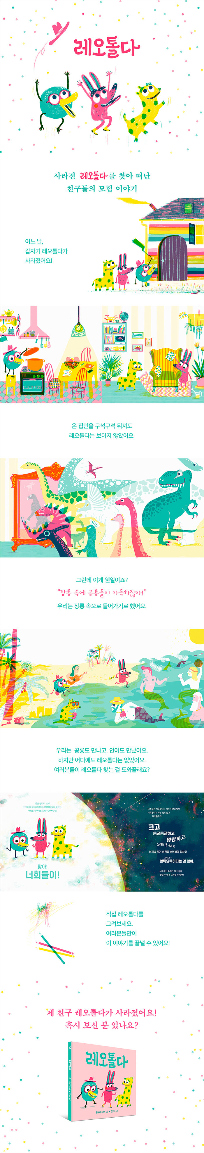 어느 날 찾아간 레오톨다 집에는 아무도 없었다. 세 친구들은 레오톨다를 찾으러 장롱 속으로 들어간다. 장롱 문을 연 순간 공룡들이 사는 공원, 인어들이 사는 바닷가가 펼쳐진다. 마지막까지 레오톨다를 찾지 못한 세 친구들은 독자인 우리에게 도움을 구한다. 누군가에게 도움을 받고, 도움을 청하는 것이 함께 사는 데 꼭 필요한 일임을, 다시금 연대의 가치를 일깨우는 그림책이다.