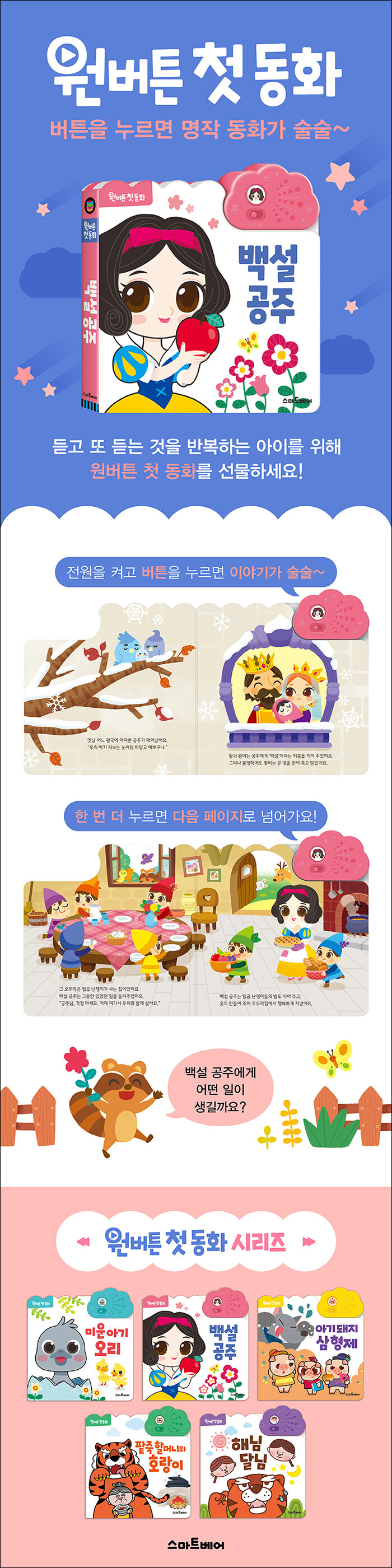 듣고 또 듣는 것을 반복하는 아이를 위해 <원버튼 첫 동화>를 선물하세요. 부모님의 도움 없이 버튼 하나로 재생되는 명작 이야기 속으로 들어가 마음껏 상상의 나래를 펼칠 수 있습니다. 연극 무대에 초대된 것 같은 실감 나는 사운드와 함께 명작 동화 속 세상으로 여행을 떠나 보세요.