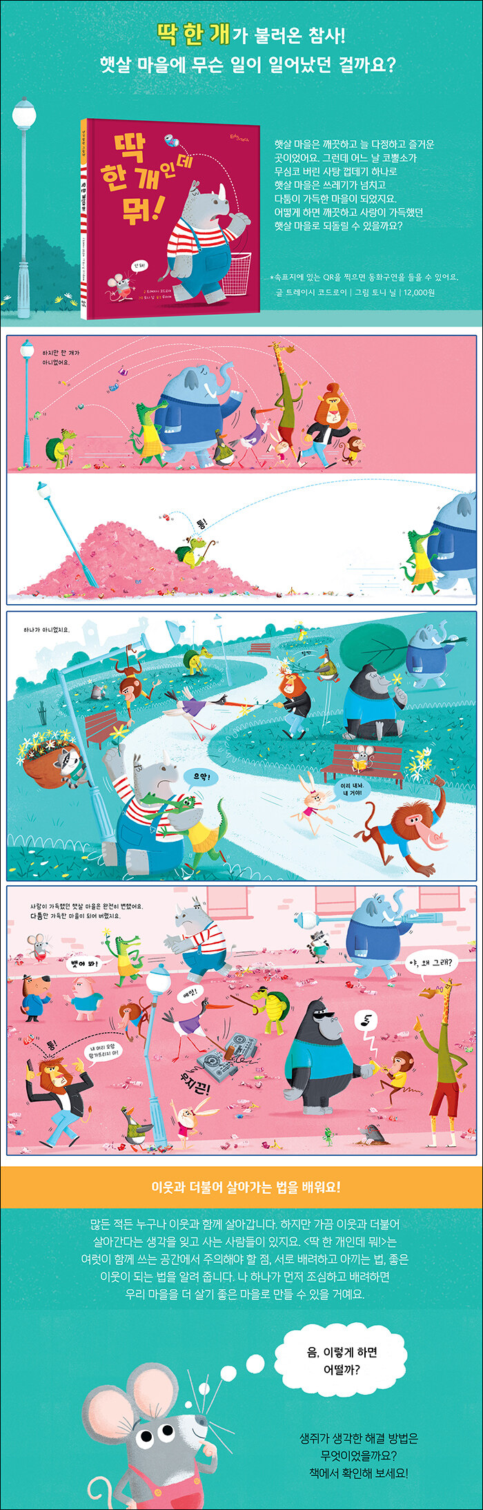 햇살 마을에 무슨 일이 일어났던 걸까요?햇살 마을은 깨끗하고 늘 다정하고 즐거운 곳이었어요. 그런데 어느 날 코뿔소가 무심코 버린 사탕 껍데기 하나로 햇살 마을은 쓰레기가 넘치고 다툼이 가득한 마을이 되었지요. 어떻게 하면 깨끗하고 사랑이 가득했던 햇살 마을로 되돌릴 수 있을까요?
