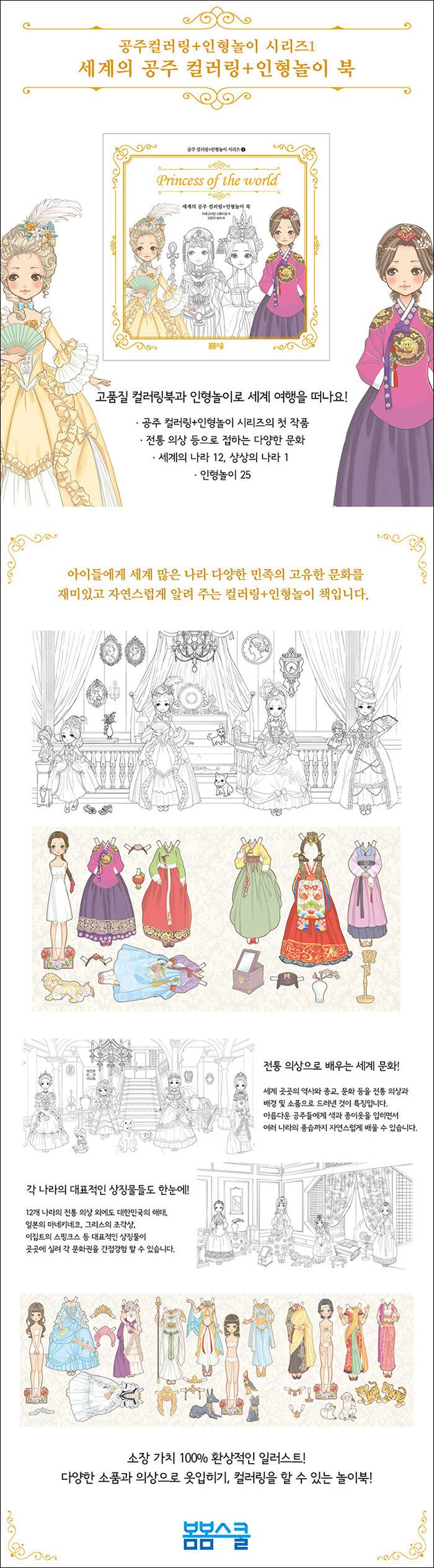 전통 의상으로 배우는 세계 문화봄봄스쿨의 ‘공주 컬러링+인형놀이 시리즈’ 첫 작품인 '세계의 공주 컬러링+인형놀이 북'은 세계 곳곳의 역사와 종교, 문화 등을 전통 의상과 배경 및 소품으로 드러낸 것이 특징입니다. 아름다운 공주들에게 색과 종이옷을 입히면서 여러 나라의 풍습까지 자연스럽게 배울 수 있습니다.