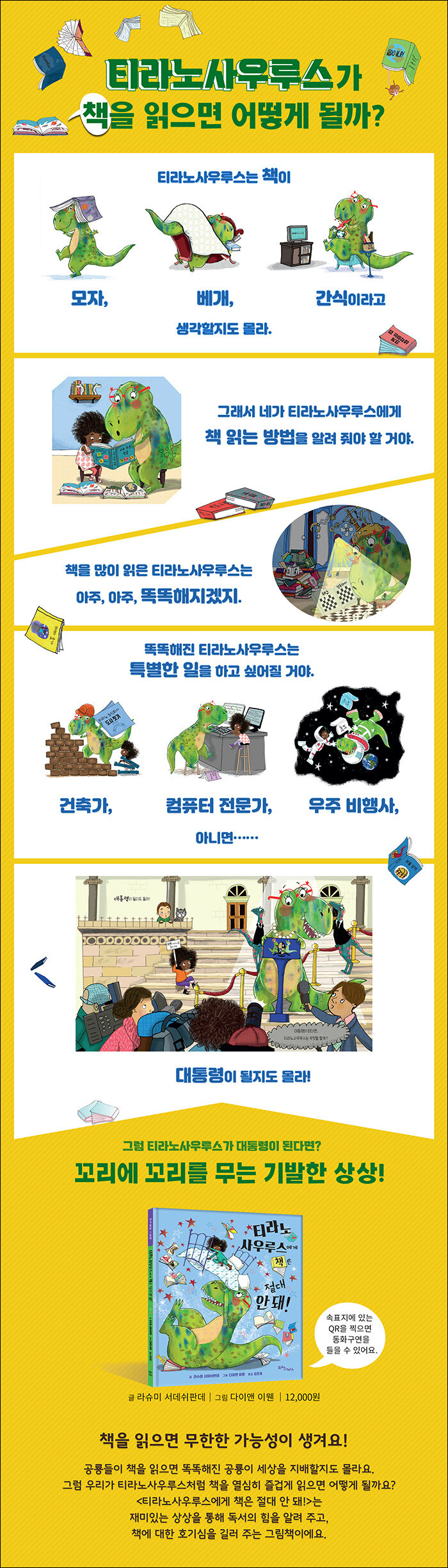 그럼 우리가 책을 읽으면 어떻게 될까요?우리가 티라노사우루스처럼 책을 열심히 즐겁게 읽으면 어떻게 될까요? 티라노사우루스가 세상을 똑똑한 공룡으로 가득하게 만들었던 것처럼, 정말 정말 똑똑해져서 우리가 원하는 세상을 만들 수 있을지도 몰라요. <티라노사우루스에게 책은 절대 안 돼!>는 재미있는 상상을 통해 독서의 힘을 알려 주고, 책에 대한 호기심을 길러 주는 그림책입니다.