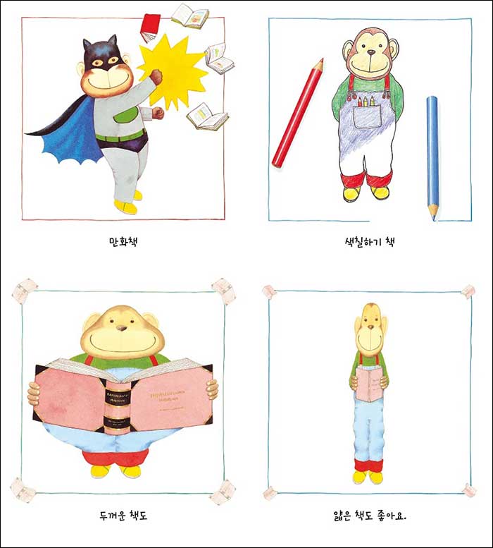 책을 한 가득 들고 ‘책이 좋아요’ 고백하는 침팬지 친구의 얼굴에는 행복감이 가득해서, 그 진위를 따지기 보다 ‘그래, 넌 어떤 책이 좋아?’ 물으며 자연스럽게 책장을 넘기게 된다. 세상에는 별의별 책들이 많을 텐데, 침팬지 친구는 먼저 웃기는 책, 무서운 책에 대해 이야기한다.