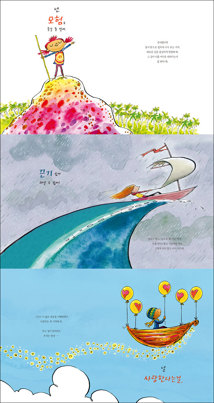 여백과 채움의 조화가 보여 주는 다양한 세상을 펼쳐낸 그림책하얀 배경 위에 단순하지만 흐트러짐 없는 선과 그 안을 꼭꼭 채운 맑은 색감의 수채화 그림이 돋보입니다. 피터 H. 레이놀즈 작가는 모험을 준비하는 모습이나 새로운 친구를 사귀는 장면, 화려한 옷과 액세서리를 두르고 다양한 모습의 나를 만나는 장면 등 도전 의식을 전하는 장면에서는 인물에만 생동감 있게 색을 입혀 긍정적이고 적극적인 메시지를 힘껏 끌어 올렸습니다. 반대로 거센 파도를 마주한 위기와 고난의 장면은 마치 그 어려움을 함께 겪는 듯한 착각이 들 정도로 여백 없이 먹구름 가득 낀 하늘로 배경을 칠해 그 위기감을 더욱 조성했지요. 그러다 그 어려움도 받아들이고 인내하는 장면부터는 다시 여백을 두어 긴장감을 덜고 평온함을 느끼게 하며 순탄하지만은 않은 우리의 인생과 꼭 닮은 삶을 마음껏 펼쳐 보였습니다. 책에는 장면마다 전하는 메시지와 함께 작가가 표현한 그림을 찾아서 보는 신선한 재미도 놓칠 수 없습니다. 적절한 호흡과 섬세함으로 글과 그림의 조화를 완벽하게 끌어올린 작가의 그림을 한 권의 그림책 안에서 마음껏 감상할 수 있을 것입니다.