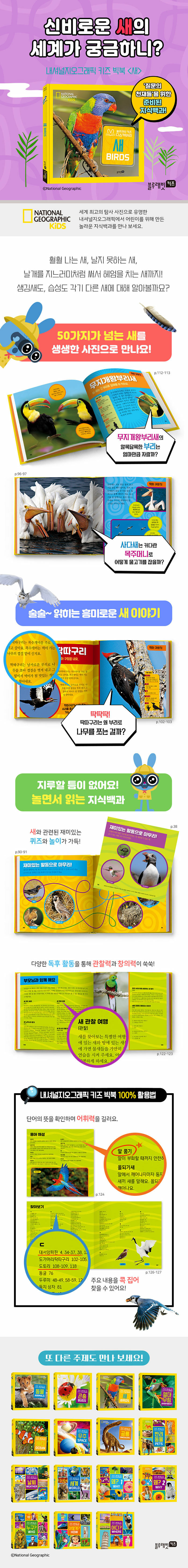 백 마디의 말보다 한 장의 사진으로 전하는 생생한 지식!유명 사진작가들이 찍은 수백만 장의 사진 중 엄선하여 구성한 내셔널지오그래픽 키즈의 지식백과는, 금방이라도 튀어나올 듯 생동감 넘치는 장면을 포착해 낸 특별한 사진들로 가득해요. 둥지에서 용감하게 뛰어내리는 아기 원앙, 다정하게 춤을 추는 두루미 커플, 커다란 목주머니에 물고기를 퍼 담는 사다새 등 눈길을 사로잡는 생생한 사진과 쉽고 재미있는 글이 어우러져 시간 가는 줄 모르고 읽게 될 거예요.